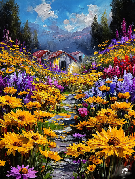 A stone path meanders through a riot of blossoms — yellow, purple, red, and pink spill across the garden in full bloom. Three white cottages nestle beneath tall trees, their red roofs glowing under a bright blue sky. Mountains rise in the distance, and the air feels like memory. This is not just scenery — it’s sanctuary. The flowers don’t decorate; they welcome. The path doesn’t lead; it invites.